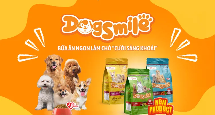 DOGSMILE là tên gọi với ý nghĩa Bữa ăn ngon làm Boss “cười sảng khoái", vậy nên các bé chó trong hình đều đang cười rất tươi vì được thưởng thức các bữa ăn ngon lành.